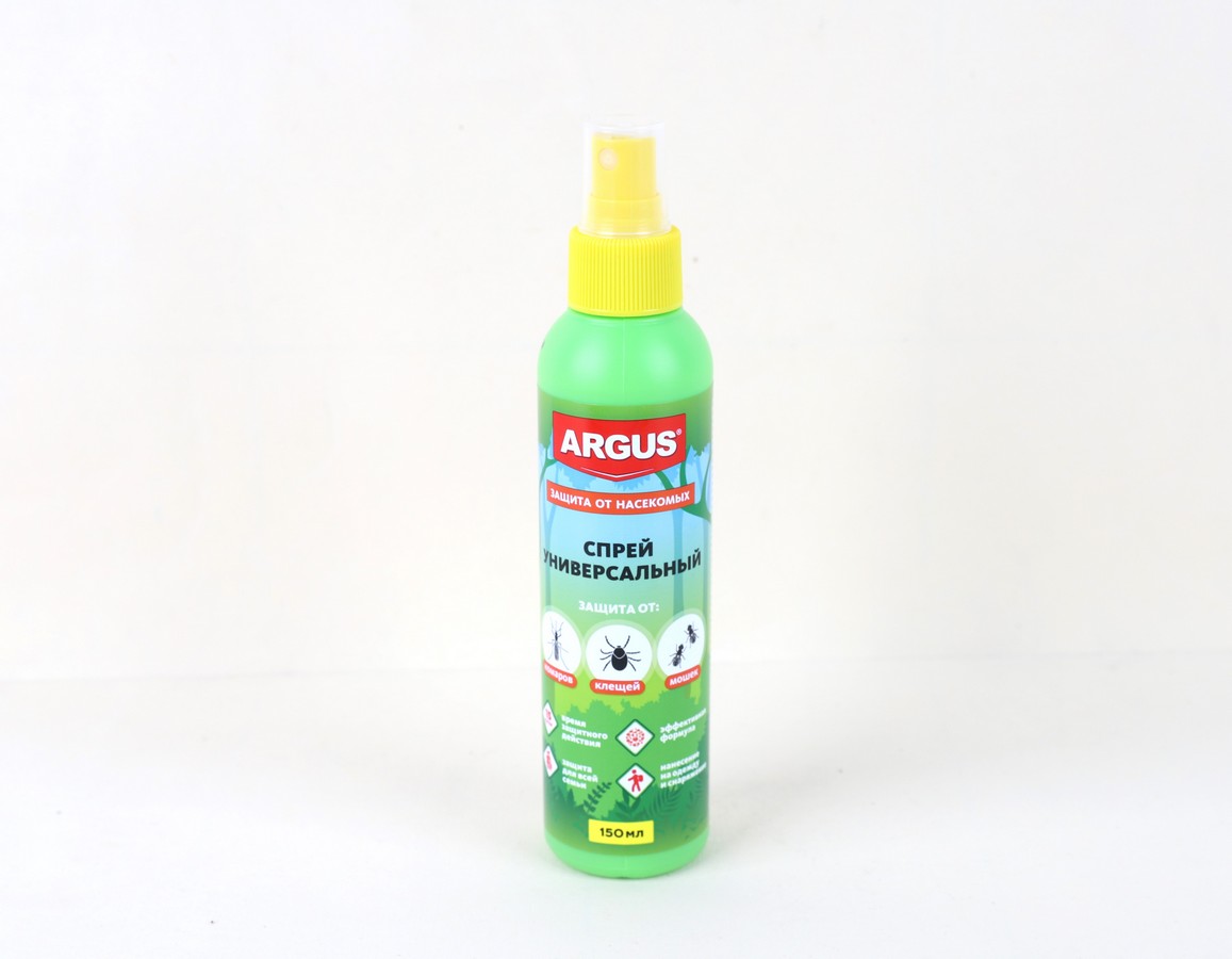 Спрей универсальный ARGUS предназанчен для защиты людей от кровососущих насекомых - комаров, клещей, мокрецов, москитов, мошек - при обработке одежды, занавесей, пртивомоскитных сеток и другого снаряжения из ткани. Применение: Разложить или развесить одежду для обработки на воздухе или в проветриваемом помещении. Расположить одежду и направить струю по направлению ветра. Средство распылять на изделие с расстояния 20 - 25 см от них, держа упаковку на вытянутой руке, из расчета 1 нажим на распылительную головку на участок 10 х 10 см. Особенно тщательно обработать брюки вокруг щиколоток, голеней, коленей, бедер и места возможного проникновения клещей к телу. Одежду просушить (не менее 2 часов) и надевать на нижнее белье. Повторную обработку одежды проводить через 10 - 15 суток или после стирки. Не обрабатывать одежду на человеке и не надевать ее до полного высыхания. Не обрабатывать кожу. Время защитного действия от клещей - до 15 суток, при условии хранения обработанной одежды в закрытом полиэтиленовом