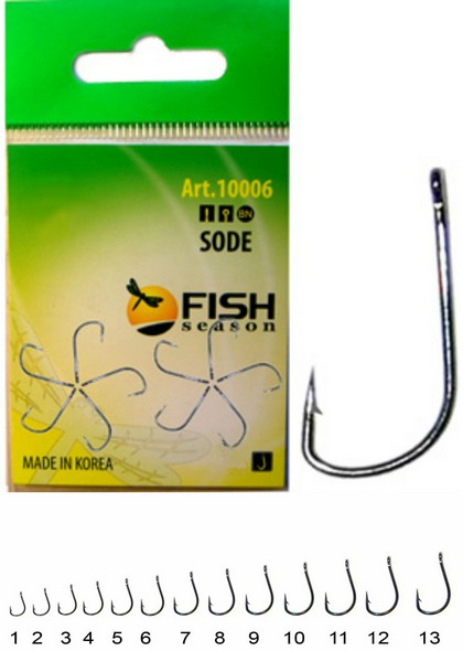 SODE. Классическая модель крючков. Идеально подходят для ловли поплавочной удочкой большинства видов мирных рыб, включая некрупного карпа. Предназначены для насаживания опарыша, червя, мотыля, распаренной перловой крупы.