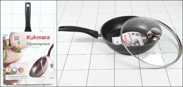 Сковорода Kukmara изготовлена методом кокильного литья из специального пищевого алюминиевого сплава с 5-слойным антипригарным мраморным покрытием на водной основе. В состав покрытия входят частицы каменной породы, которые обеспечивают исключительную прочность и твердость покрытия. Антипригарное покрытие экологично и безопасно для организма, оно позволяет использовать минимальное количество масел и жиров, чтобы сохранить естественный вкус продуктов. Кроме того, пища не пригорает, а после использования поверхность легко и быстро моется. Посуда имеет специальное утолщенное дно, тепло равномерно распределяется и долго сохраняется по всей поверхности посуды. При приготовлении пищи дно и стенки не деформируются благодаря прочному корпусу, отлитому вручную. Съемная пластиковая ручка не нагревается в процессе эксплуатации. Посуда подходит для газовых, электрических, стеклокерамических плит. Можно мыть в посудомоечной машине.