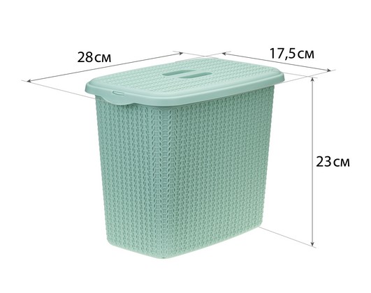 175x280x230 мм Контейнер для стирального порошка "ВЯЗАНИЕ" изготовлен из высококачественного пластика. Можно высыпать стиральный порошок в контейнер или хранить в нем моющие средства. Сверху он закрывается надежной крышкой. Текстура поверхности напоминает вязаный трикотаж. Контейнер вместителен и не позволит просочиться влаге.