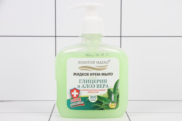 Жидкое мыло-крем ЗОЛОТОЙ ИДЕАЛ "Глицерин и алоэ вера" идеально подходит для использования в офисах, отелях, ресторанах и других общественных местах. Средство универсального применения с антибактериальным эффектом отлично очищает и смягчает кожу, обеспечивает уход и увлажнение, обладает приятным ароматом алоэ вера. Подходит для всех типов кожи и не содержит формальдегида. Легко очищает, ухаживает и увлажняет, равномерно распределяется по коже и легко смывается водой, даря удовольствие всей семье. Благодаря входящим в состав смягчающим компонентам и сбалансированному уровню рН сохраняет защитные функции кожи, не вызывая сухости и раздражения. Поставляется в флаконе с дозатором. Объем - 300 мл.