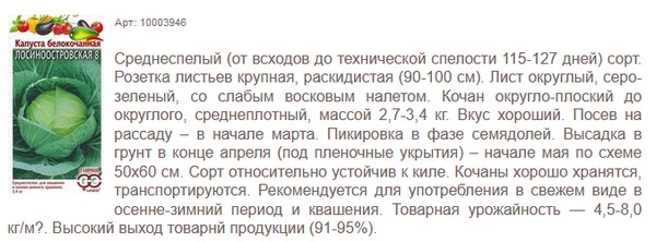 Среднеспелый (от всходов до технической спелости 115-127 дней) сорт. Розетка листьев крупная, раскидистая (90-100 см). Лист округлый, серо-зеленый, со слабым восковым налетом. Кочан округло-плоский до округлого, среднеплотный, массой 2,7-3,4 кг. Вкус хороший. Посев на рассаду – в начале марта. Пикировка в фазе семядолей. Высадка в грунт в конце апреля (под пленочные укрытия) – начале мая по схеме 50х60 см. Сорт относительно устойчив к киле. Кочаны хорошо хранятся, транспортируются. Рекомендуется для употребления в свежем виде в осенне-зимний период и квашения. Товарная урожайность — 4,5-8,0 кг/м?. Высокий выход товарнй продукции (91-95%).