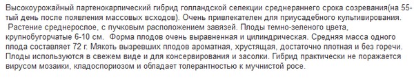 Высокоурожайный партенокарпический гибрид голландской селекции среднераннего срока созревания(на 55-тый день после появления массовых всходов). Очень привлекателен для приусадебного культивирования. Растение среднерослое, с пучковым расположением завязей. Плоды темно-зеленого цвета, крупнобугорчатые 6-10 см. Форма плодов очень выравненная и цилиндрическая. Средняя масса одного плода составляет 72 г. Мякоть вызревших плодов ароматная, хрустящая, достаточно плотная и без горечи. Плоды используются в свежем виде и для консервирования и засолки. Гибрид практически не поражается вирусом мозаики, кладоспориозом и обладает толерантностью к мучнистой росе.