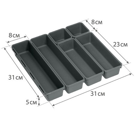 Габариты: 310x310x50 мм Пластиковые лотки не боятся воды и при необходимости легко моются Удобно хранить: канцелярию, кухонные инструменты, аксессуары для волос, косметику Комплектация: лоток 80 ? 80 мм – 2 шт лоток 80 ? 230 мм – 2 шт лоток 80 ? 310 мм – 2 шт