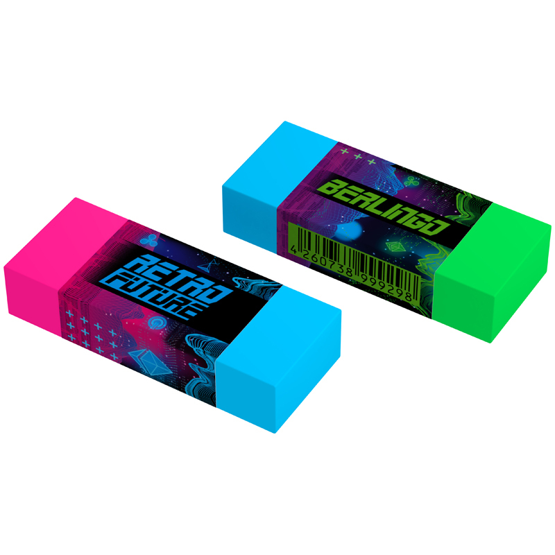 Ластик Berlingo Retro future размера 48*18*10 мм не токсичен, выполнен из ECO-PVC, не токсичен. Изделие прекрасно справляется с линиями от чернографитного карандаша, не оставляет следов и грязных разводов после себя, не повреждают бумагу. Каждый ластик упакован в картонный держатель и пленку, которые защищают ластик от грязи и пыли. У каждого изделия есть штрих-код. В ассортименте представлено 2 цвета ассорти. Поставляются в дисплей боксе.