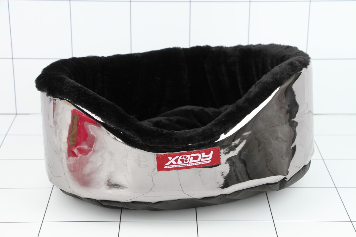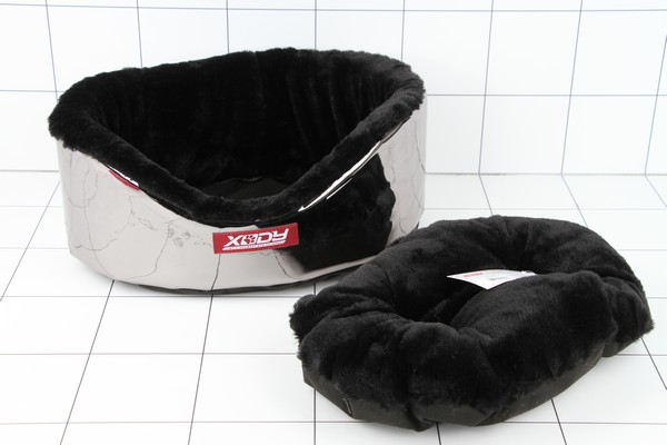 Материал лежака мех и эко-кожа с эффектом зеркала. Борта лежака из поролона. Лежак укомплектован съемной двусторонней подушкой набитой холофайбером. Дно выполнено из антискользящего спанбонда. 38х26х15 см