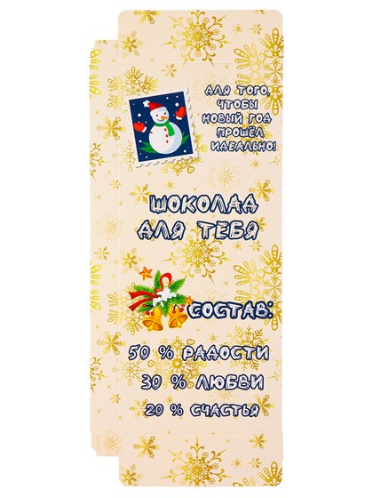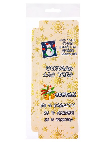 Шоколад — незаменимое дополнение к новогоднему подарку! Оригинальная упаковка любимой сладости преобразит даже банальный презент. Кроме того, она станет отличной альтернативой надоевшим открыткам. Размер: 19х8 см.