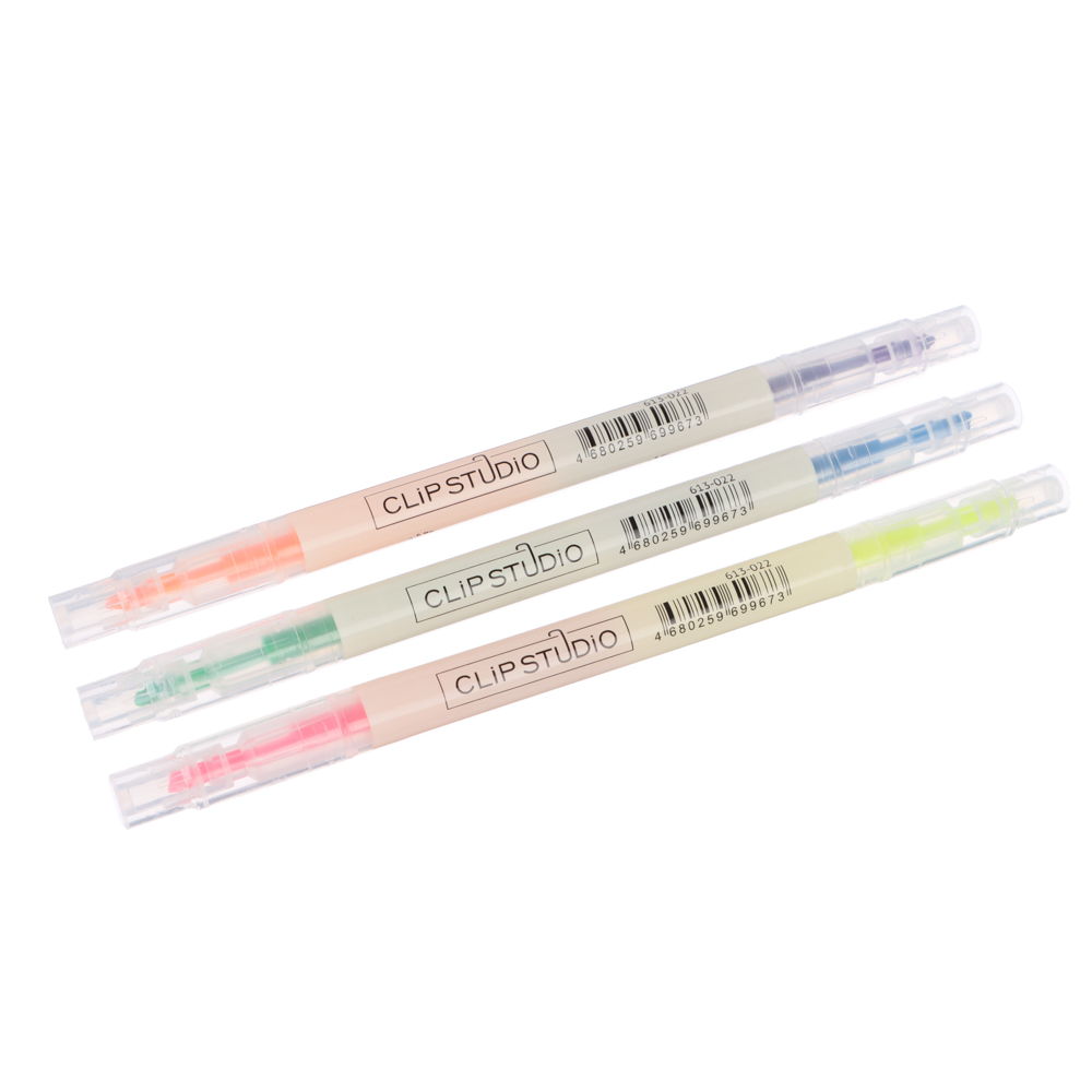 Маркер-выделитель от ClipStudio - это 2-сторонний маркер-выделитель, разные цвета с каждой из сторон. Его используют, чтобы выделять в печатном и рукописном тексте важную информацию. Хорошо лежит в руке и не скользит. Толщина линии 3 мм - хватает, чтобы полностью выделить строку текста. Не отображается на ксерокопиях и факсах. Не пропитывает бумагу и не размазывает рукописный текст.