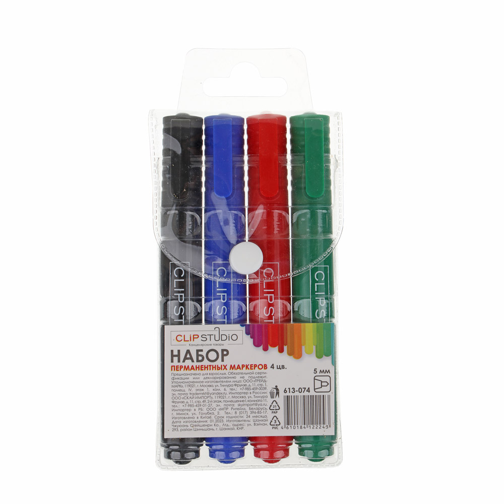 Набор перманентных маркеров с пулевидным наконечником. Маркеры подходят, чтобы писать на любых поверхностях: бумаге, картоне, пластиковых досках. Быстро высыхают и не размазываются. Ширина линии - 5 мм. В наборе 4 цвета.
