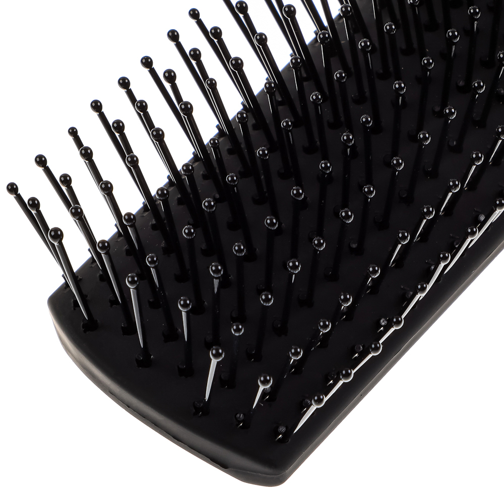 Массажер бережно распутывает локоны любой густоты и деликатно массирует кожу головы, стимулируя кровообращение и улучшая питание волос. Изогнутый корпус и узкая рабочая поверхность расчёски помогает с комфортом сделать укладку любой длины. Щетина из прочного пластика не деформируется в процессе использования и качественно производит процедуру расчесывания.