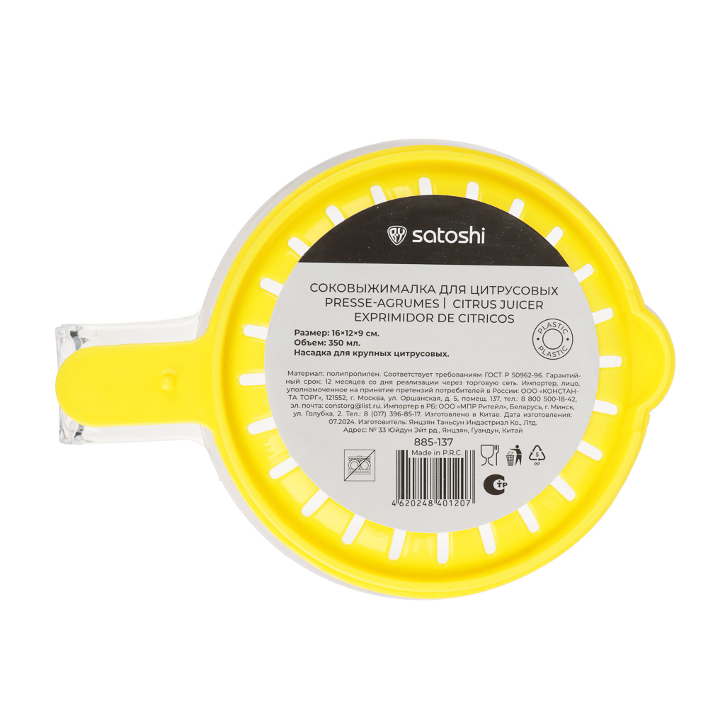 Соковыжималка для цитрусовых SATOSHI 16х12х9 см, объем 350 мл с насадкой для крупных плодов используется для ручного приготовления сока из апельсинов, лимонов и грейпфрутов. Специальная форма исключает разбрызгивание сока. Изготовлена из прочного пищевого пластика, который не выделяет вредных веществ и не вступает в контакт с продуктами. Имеет устойчивое основание и большую ручку для комфортного захвата. Насадка удобно фиксируется на емкости для компактного хранения.