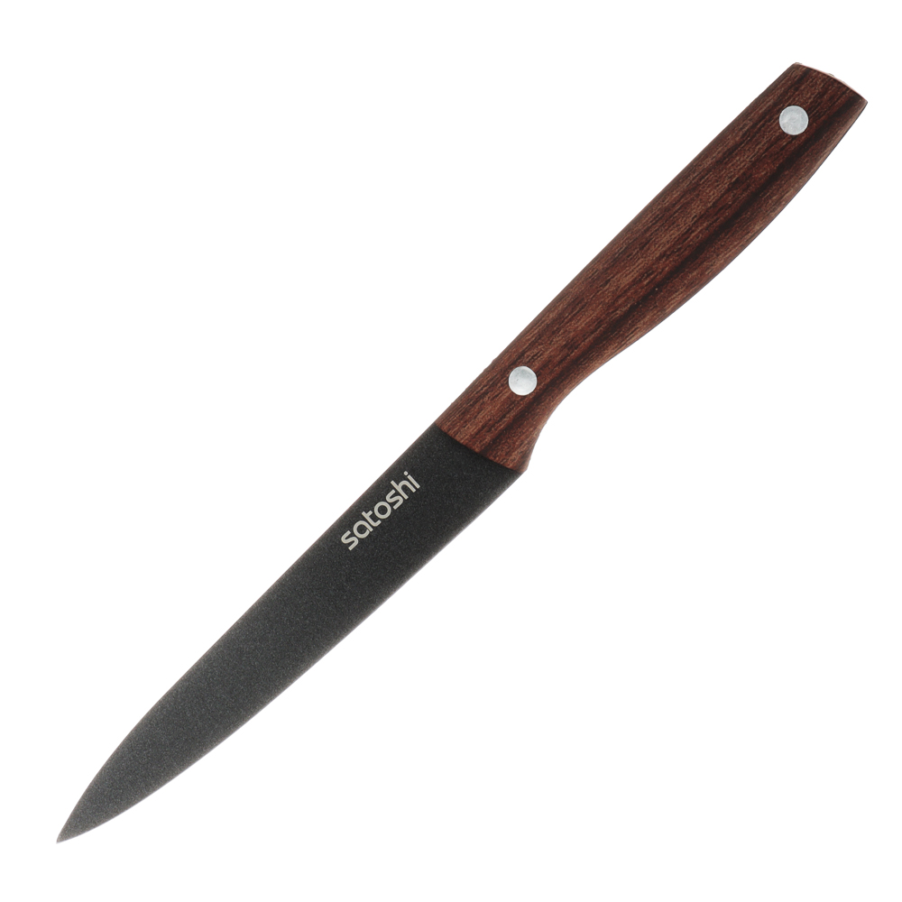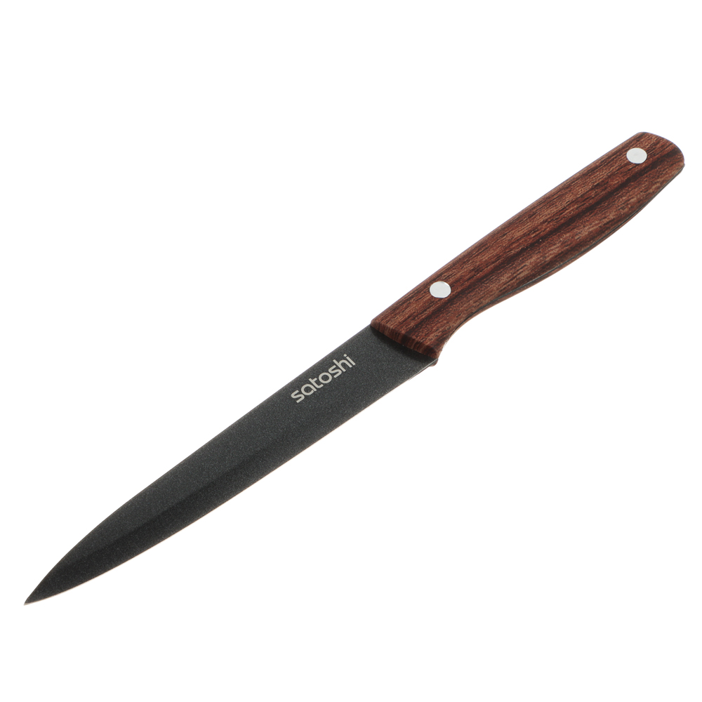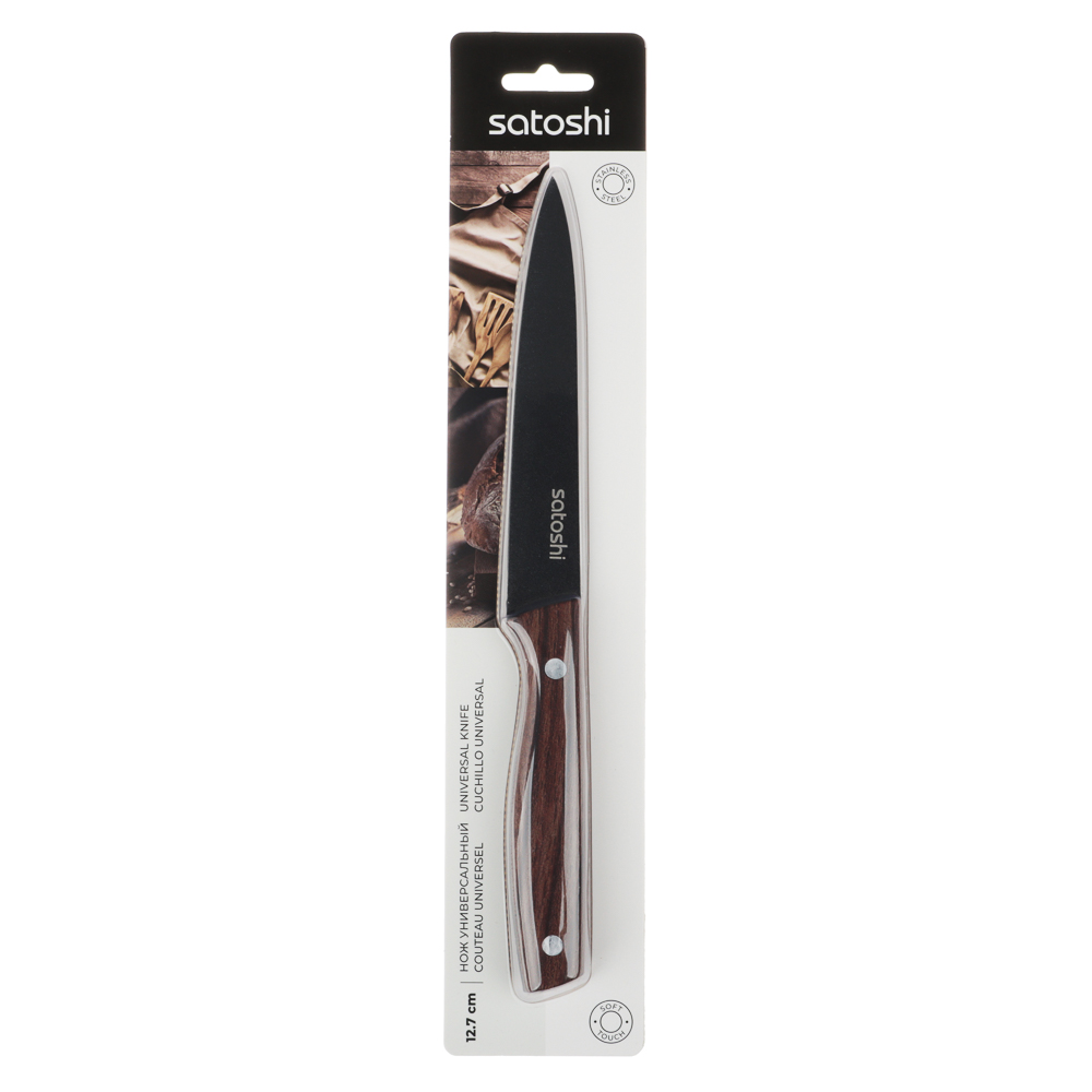 Нож кухонный универсальный SATOSHI Меллер с лезвием 12,7 см из нержавеющей стали подходит для нарезки фруктов и овощей, разделки и нарезки рыбы и мясных деликатесов, сыров и других продуктов. Геометрия клинка позволяет приспособить его под любые нужды. Нержавеющая сталь обладает хорошими эксплуатационными свойствами, коррозионностойкая, износостойкая и легко поддается заточке любыми заточными инструментами. Специальное покрытие делает процесс нарезки более комфортным, так как продукты не налипают на клинок. Рукоять с покрытием soft-touch удобно фиксируется в руке, не выскальзывая в процессе использования. Универсальный нож SATOSHI имеет стильный дизайн, вписываясь в интерьер любой кухни.
